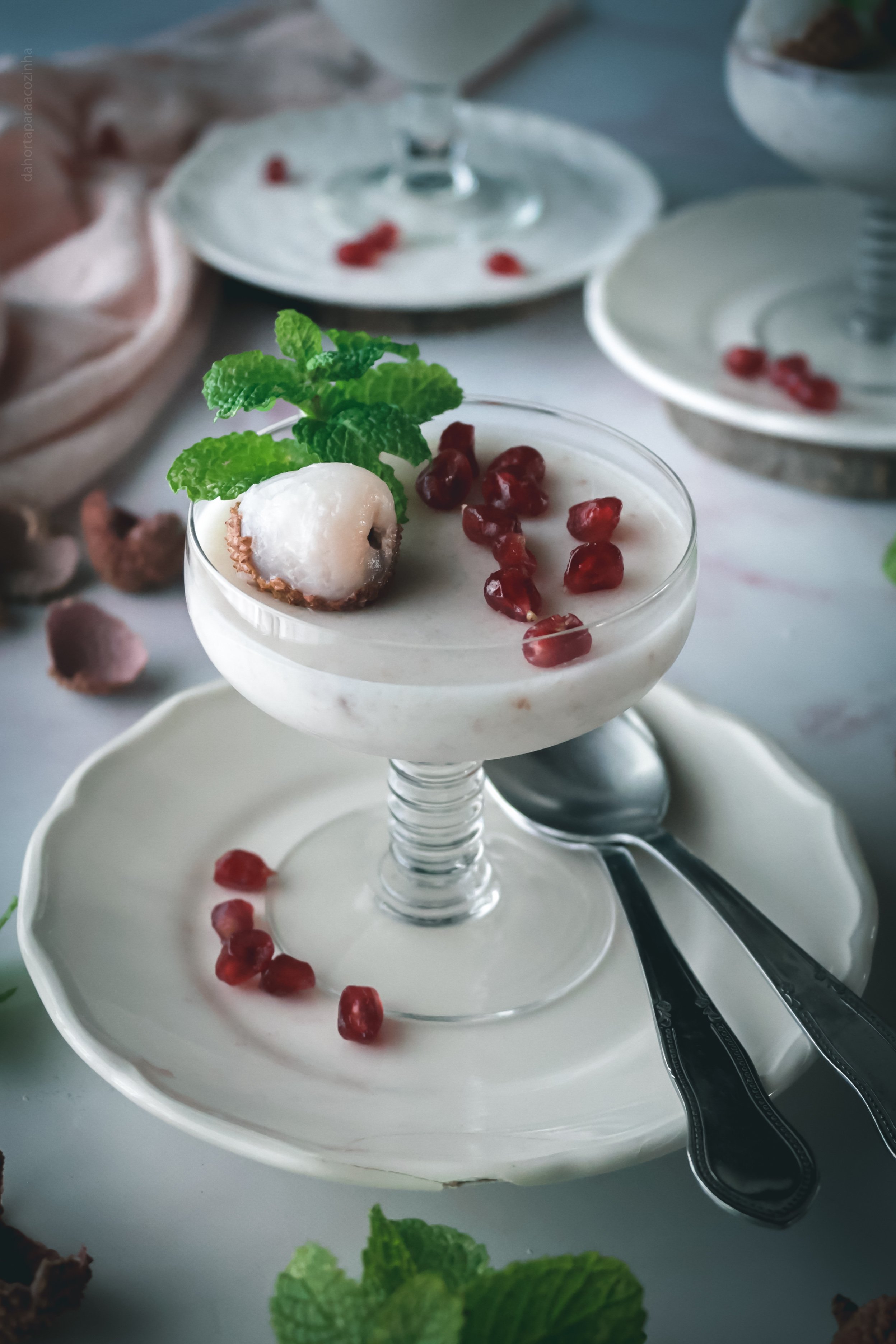 Sirva decorado com lichias, bagos de romã e algumas folhas de hortelã.