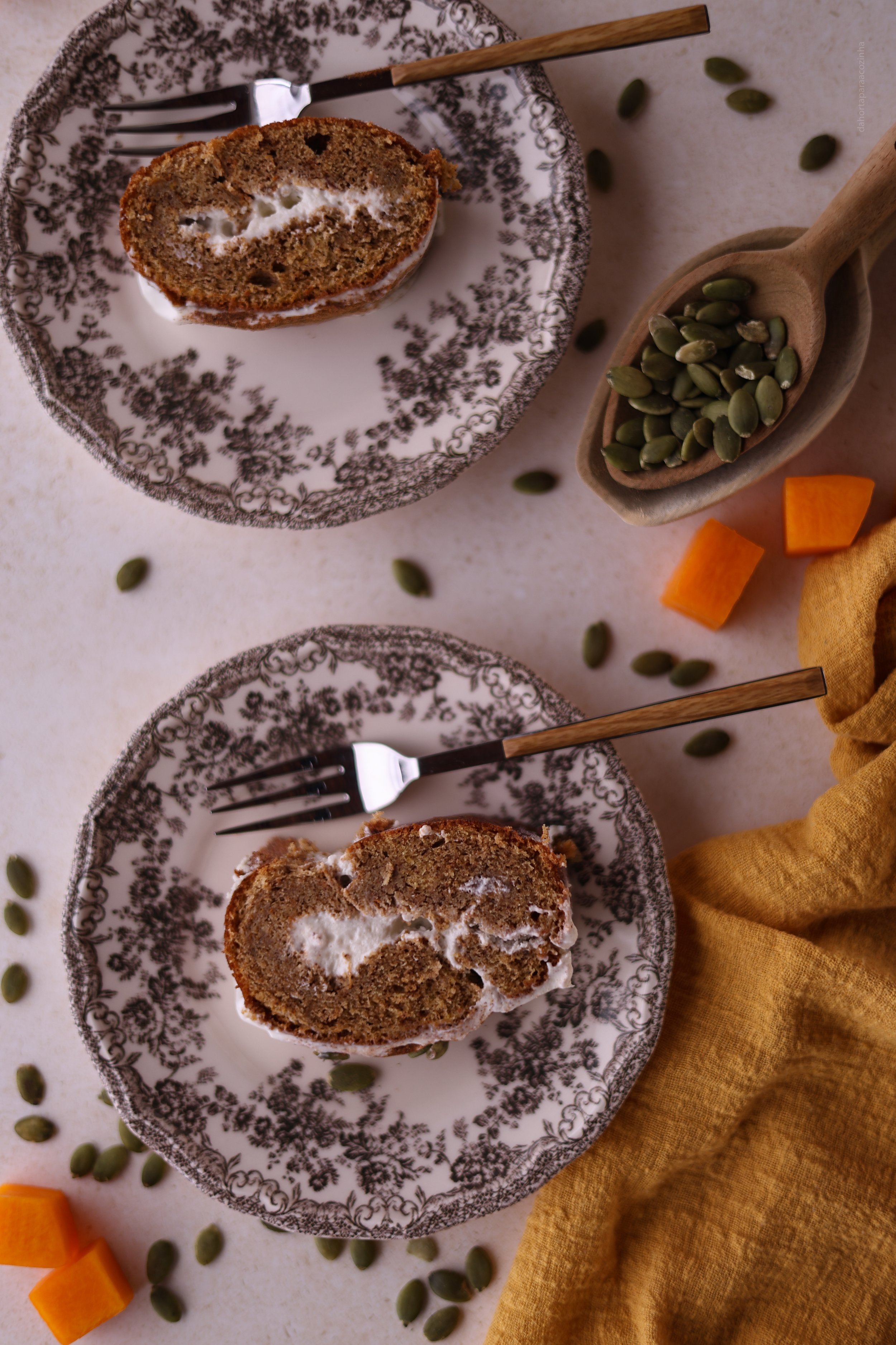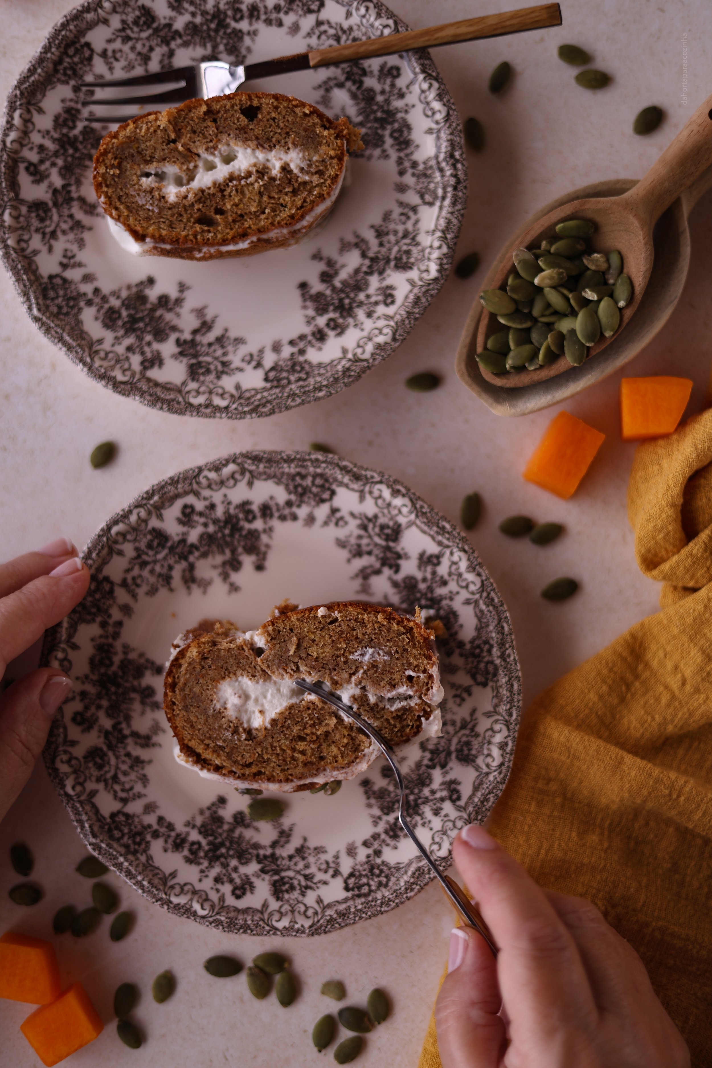 14. Antes de servir, corte as extremidades para nivelar, cubra com o restante creme de mascarpone, polvilhe com canela em pó e decore com algumas sementes de abóbora. Depois corte fatias generosas.