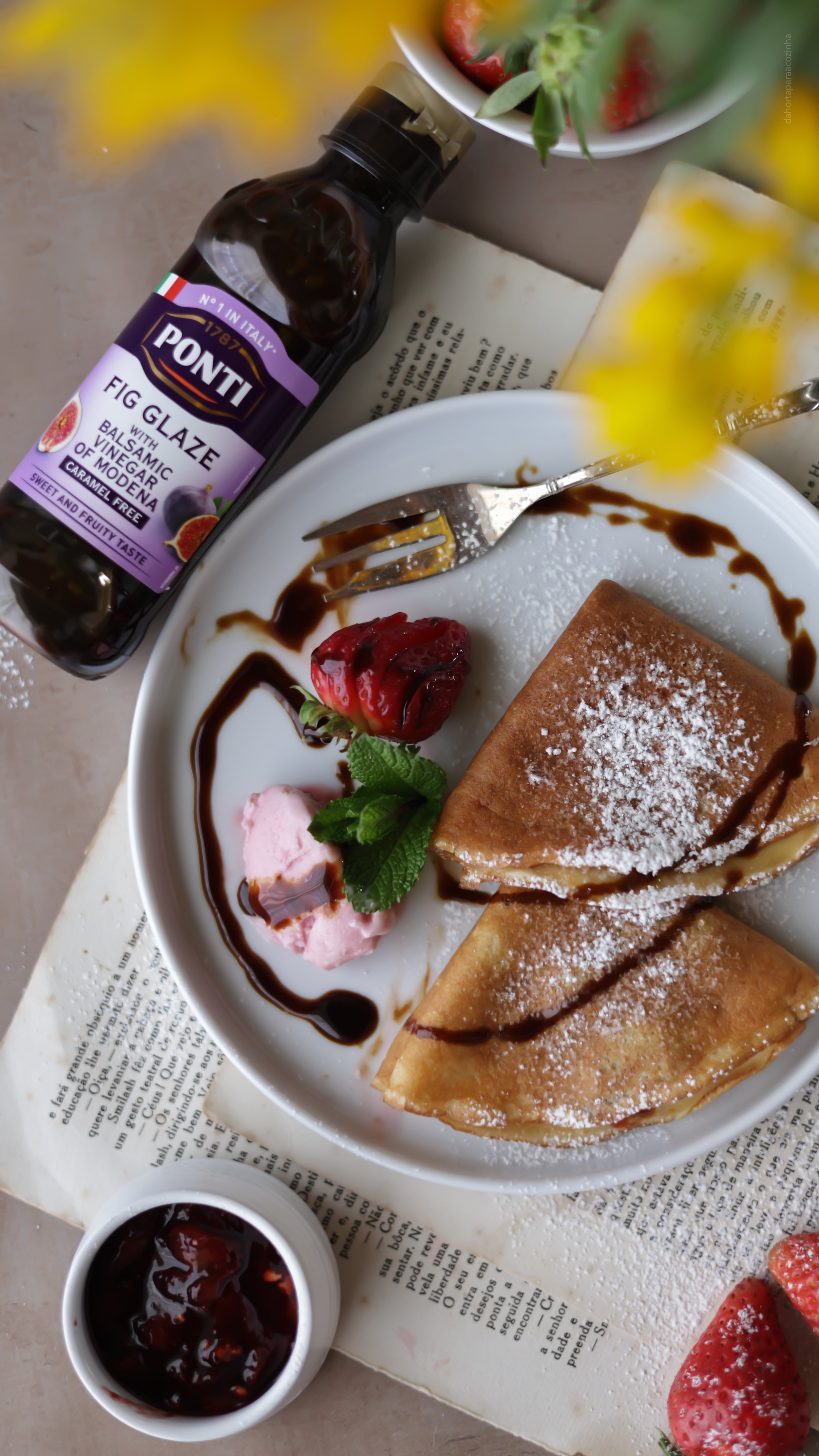 E volto outra vez aos crepes. Nesta receita, celebramos a leveza dos crepes, macios e dourados, combinados com a frescura do coulis de morangos, um verdadeiro hino à primavera. Para dar equilíbrio ao doce natural da fruta, incorporei um toque de vinagre balsâmico tradicional, da Ponti, que realça a sua intensidade e traz uma camada de acidez delicada. O grande destaque é a nova glassa de vinagre balsâmico com figo: um lançamento especial da Ponti, de sua origem italiana, espesso, aveludado e naturalmente adocicado, que une a riqueza do balsâmico à doçura envolvente do figo. Este toque final transforma a sobremesa, conferindo-lhe brilho, complexidade e sofisticação. Servidos recheados e com gelado, estes crepes tornam-se uma verdadeira celebração da primavera, com a frescura, cor e um irresistível toque italiano.