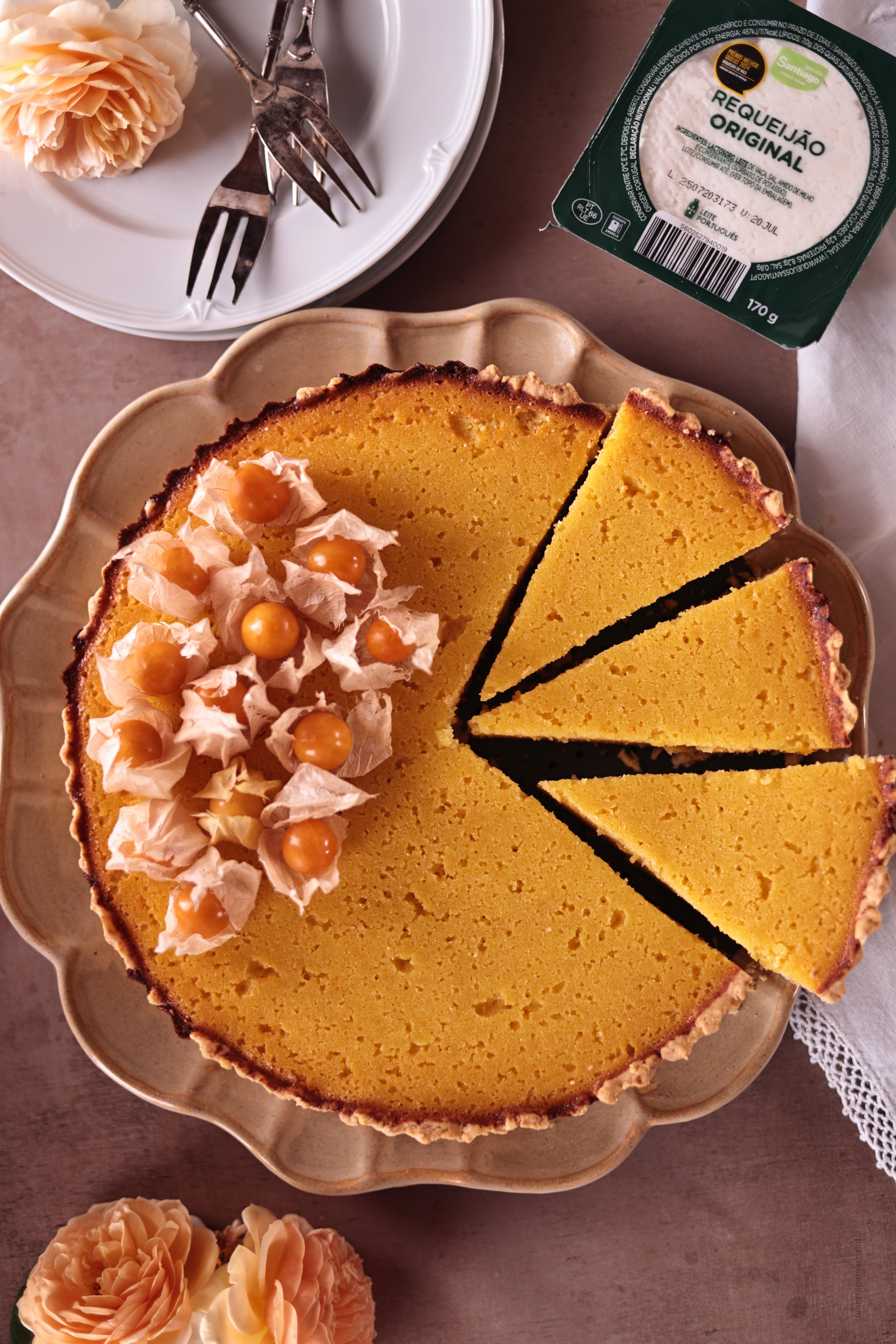 Confesso: esta tarte nasceu por acaso, como muitas das melhores coisas na cozinha. Tinha ali um requeijão de ovelha dos Queijos Santiago, daqueles bem cremosos e cheios de sabor, a olhar para mim já há alguns dias. Era para uma salada… acabou numa sobremesa. E ainda bem.