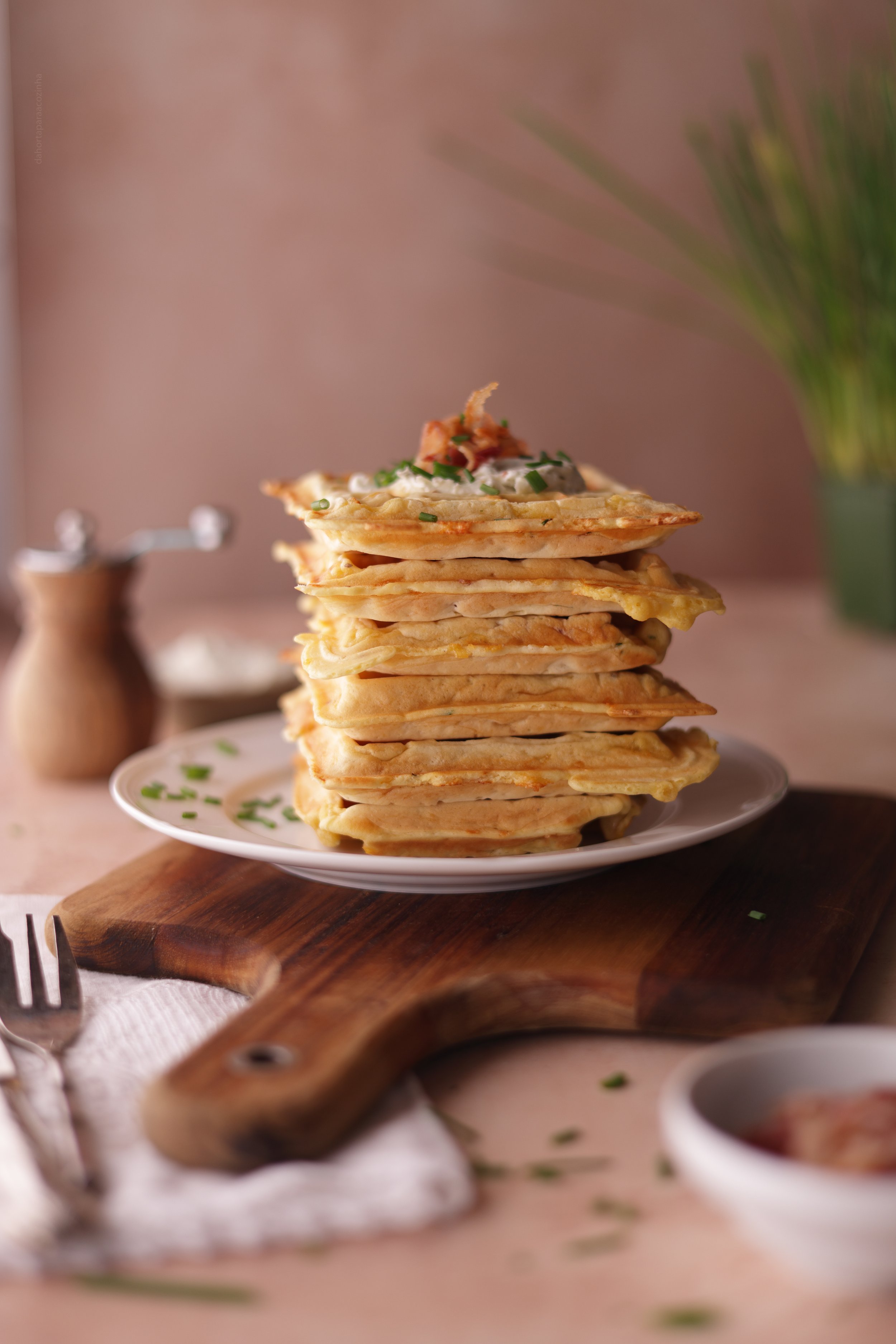 Quem me conhece sabe que adoro sair da caixa na cozinha, gosto de brincar com as receitas, trocar os doces pelos salgados e vice-versa, gosto de experimentar e de me surpreender. E hoje, em homenagem a esta data deliciosa, decidi reinventar os tradicionais waffles doces e dar-lhes um toque especial: waffles salgados de bacon e queijo cheddar.