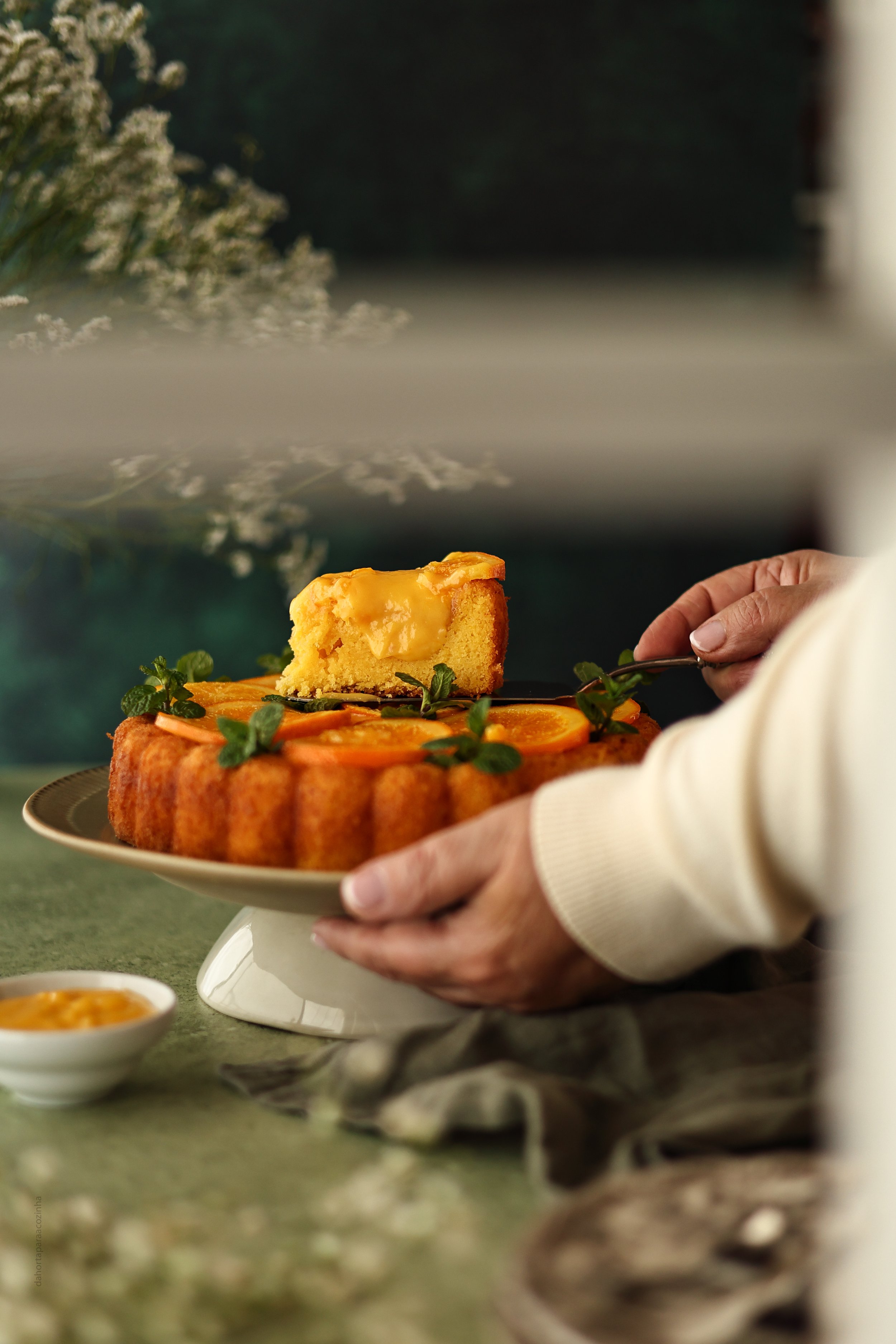 As laranjas estavam sumarentas, cheias de luz. Fiz delas um bolo simples e, porque eram generosas, um curd de laranja. Decorei-o com rodelas em calda, translúcidas como pequenos vitrais. Visualmente ficou bonito; o sabor, reconfortante. Por algumas horas foi possível esquecer a destruição lá fora. É isso que a cozinha tem de único: não apaga a tristeza, mas suspende-a. E, nesses intervalos de calor e aroma, conseguimos respirar melhor, mesmo quando o mundo à volta ainda treme.