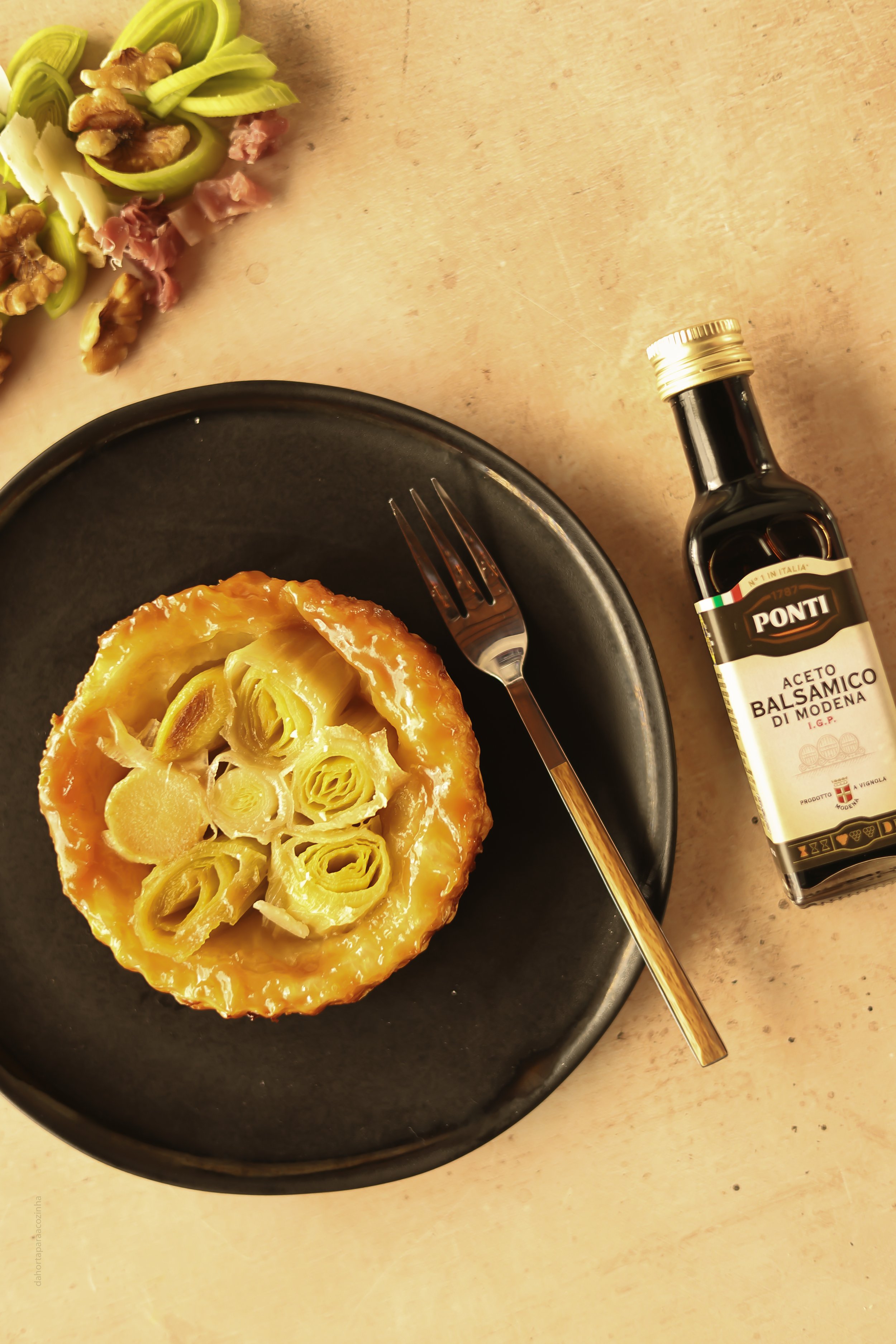 Esta tarte tatin de alho-francês é a prova disso. Uma entrada delicada, construída sobre contrastes. O vegetal adocicado, o caramelo salgado, a gordura discreta da massa, e no final as fitas de parmesão, o presunto em tiras finas e as nozes a lembrar que a textura também pensa. Nada está ali por acaso. Nada grita.