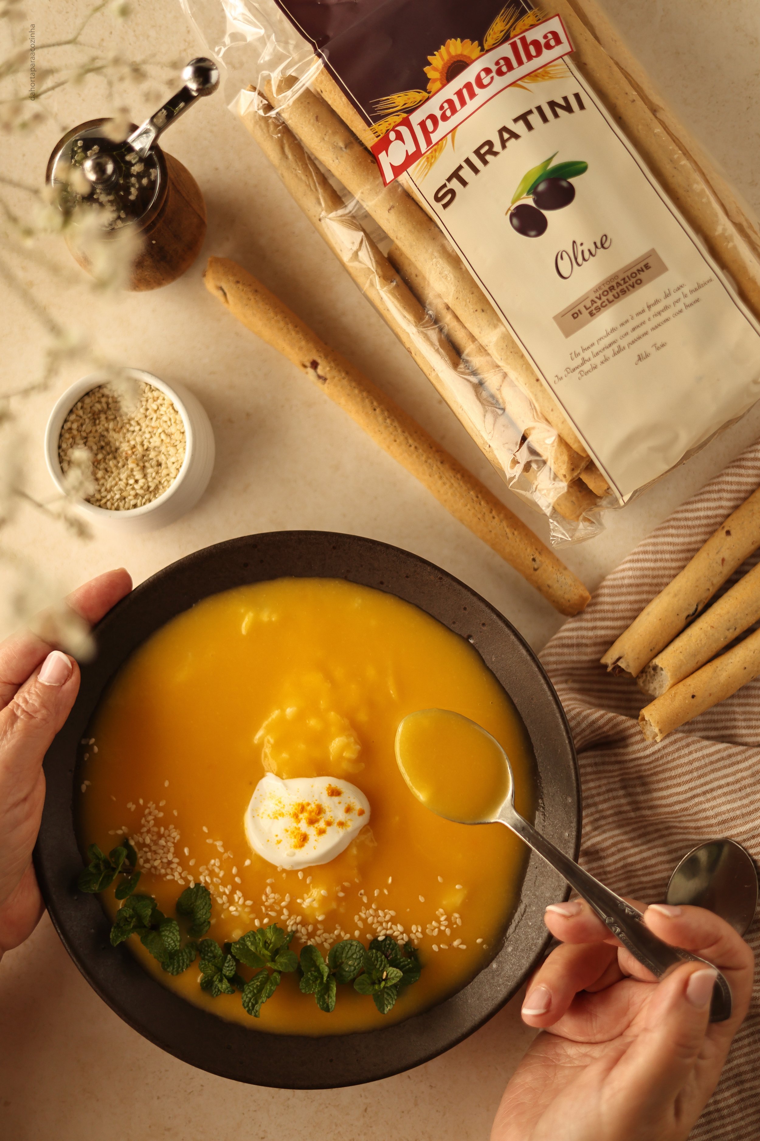 Sirva a sopa bem quente, coroada com uma colher de iogurte grego, uma pitada de especiarias a seu gosto e, se quiser, folhas de hortelã e sementes de sésamo.