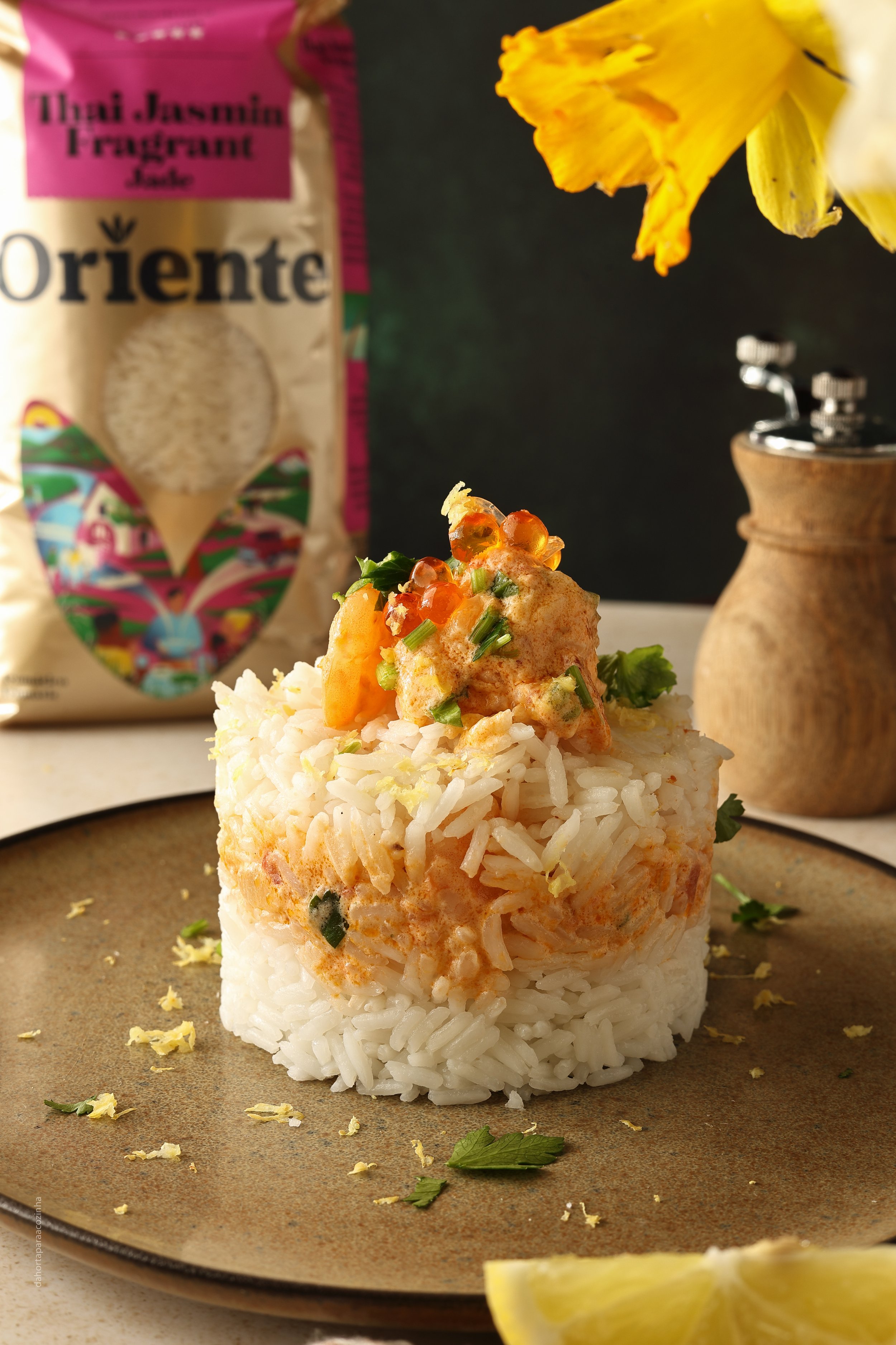 Hoje, eu e o arroz Oriente trazemos-lhe um timbale de arroz Thai Jasmin Fragrant com camarão.