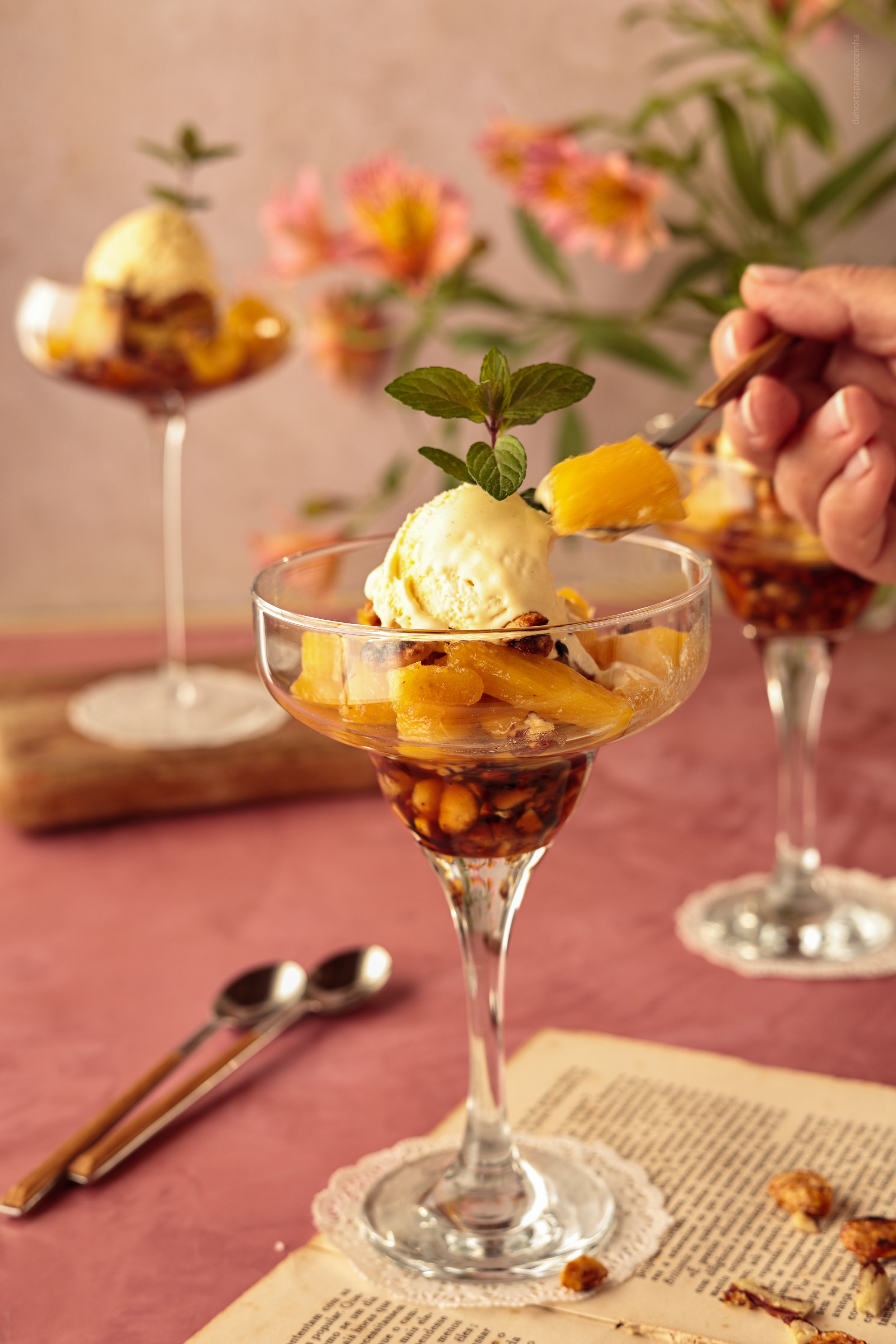 Monte no momento de servir: coloque no fundo da taça alguns frutos secos, depois o abacaxi morno, uma camada de crocante, uma bola de gelado de baunilha e termine com mais crocante.