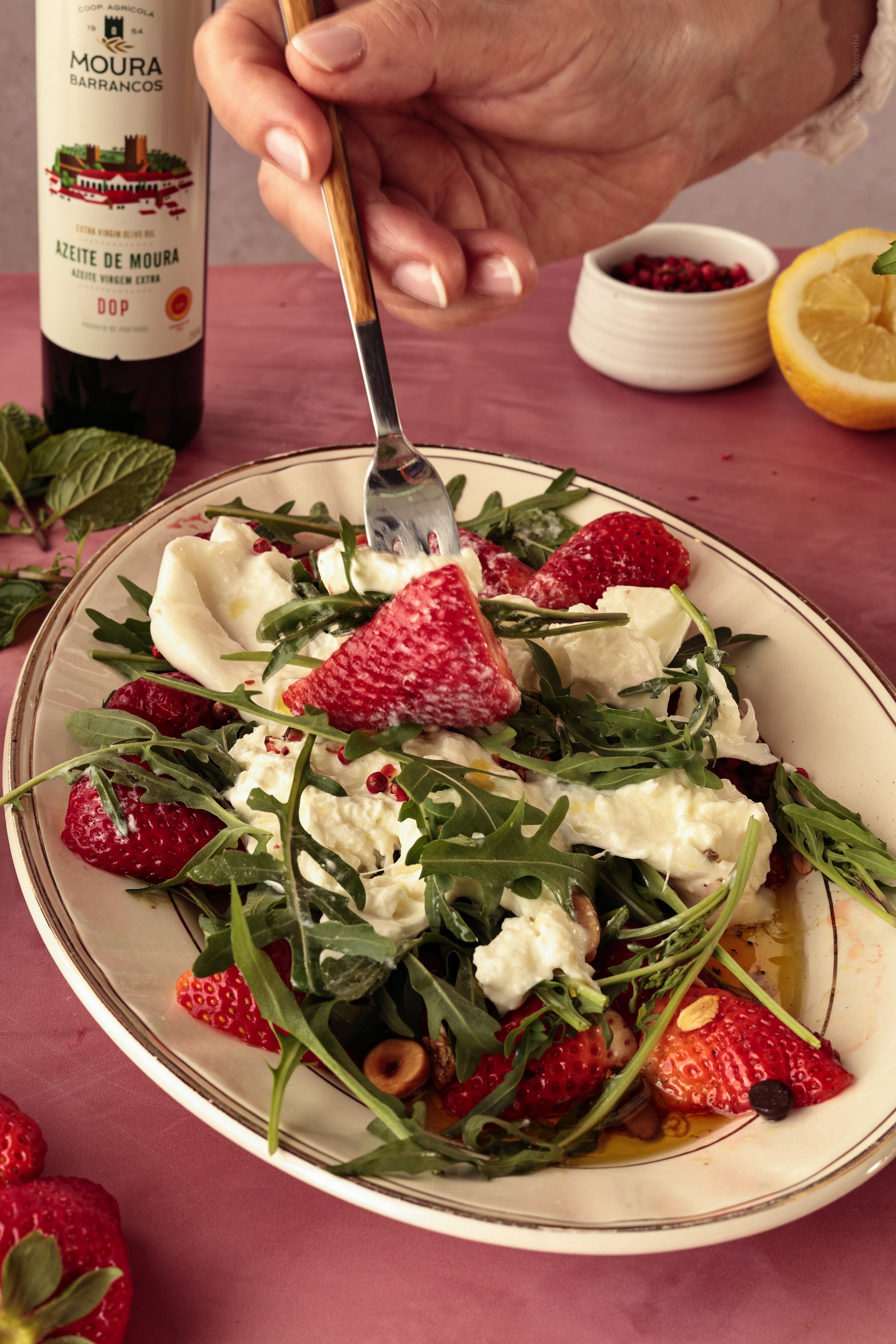 É dessa herança que nasce esta salada: morangos maduros, burrata cremosa e o azeite da Cooperativa Agrícola de Moura e Barrancos a ligar tudo — com equilíbrio, sem excesso.